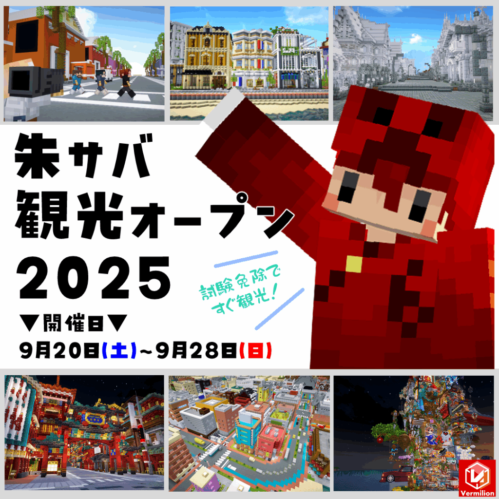 ▼開催日▼ みなさまたくさんのご参加ありがとうございました!朱サバ観光オープン2025は大好評の中 終了いたしました!サーバー参加希望者は 通常の接続方法からお入りください イベント期間・2025年 9月20日(土) 0